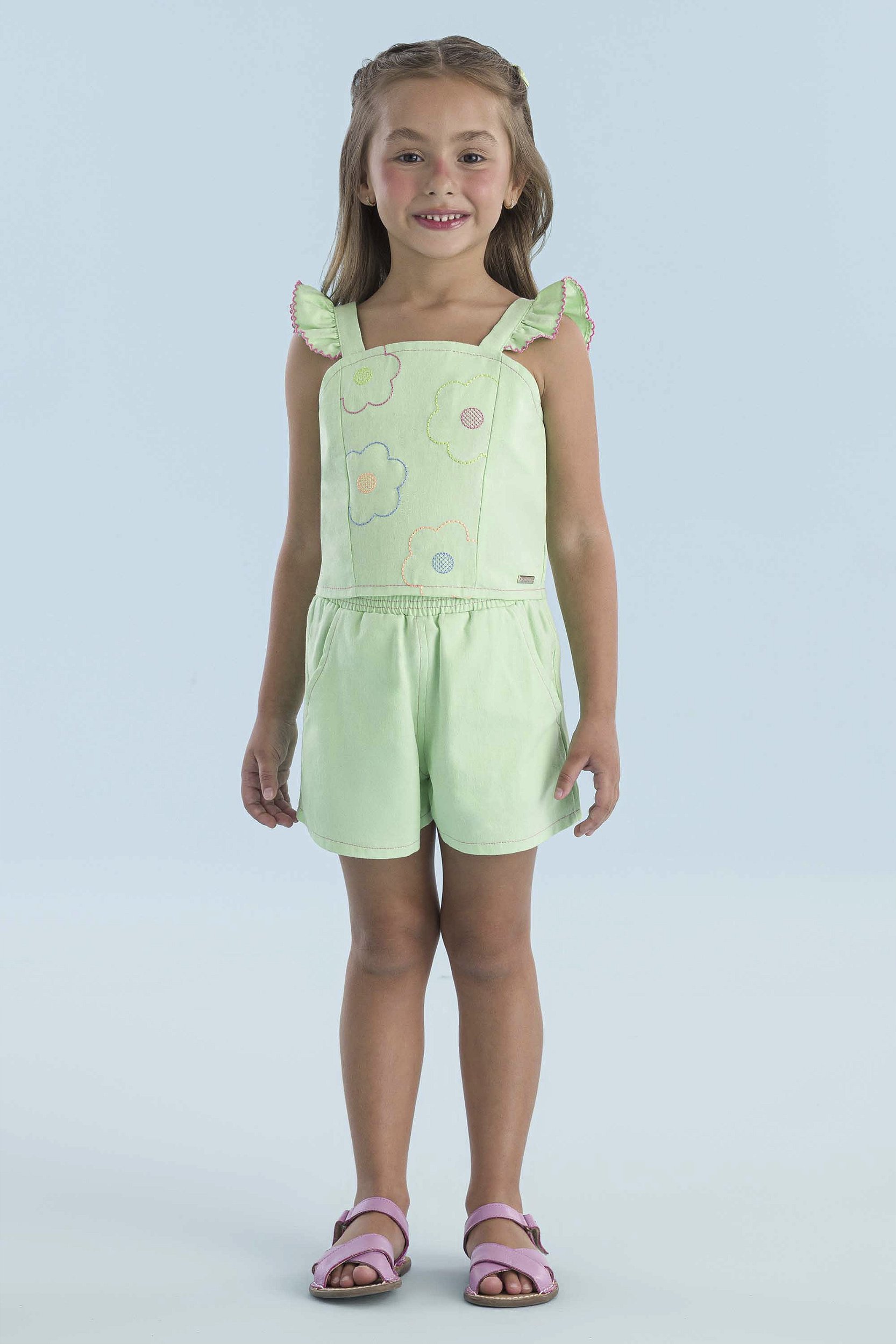 CONJUNTO BLUSA E SHORT EM JEANS ESTAMPADOS MON SUCRÉ é uma ótima opção para passeios, shopping, aniversário, um almoço ou até mesmo um jantar, além de ser muito leve, ele possui um tecido jeans super confortável e de extrema qualidade, a blusa possui alças com uma estampa bordada colorida super delicada e um short dando destaque e estilo à peça. Com cores vibrantes que estão super em alta, na Pequeninos Baby Kids você encontra na opção verde claro.