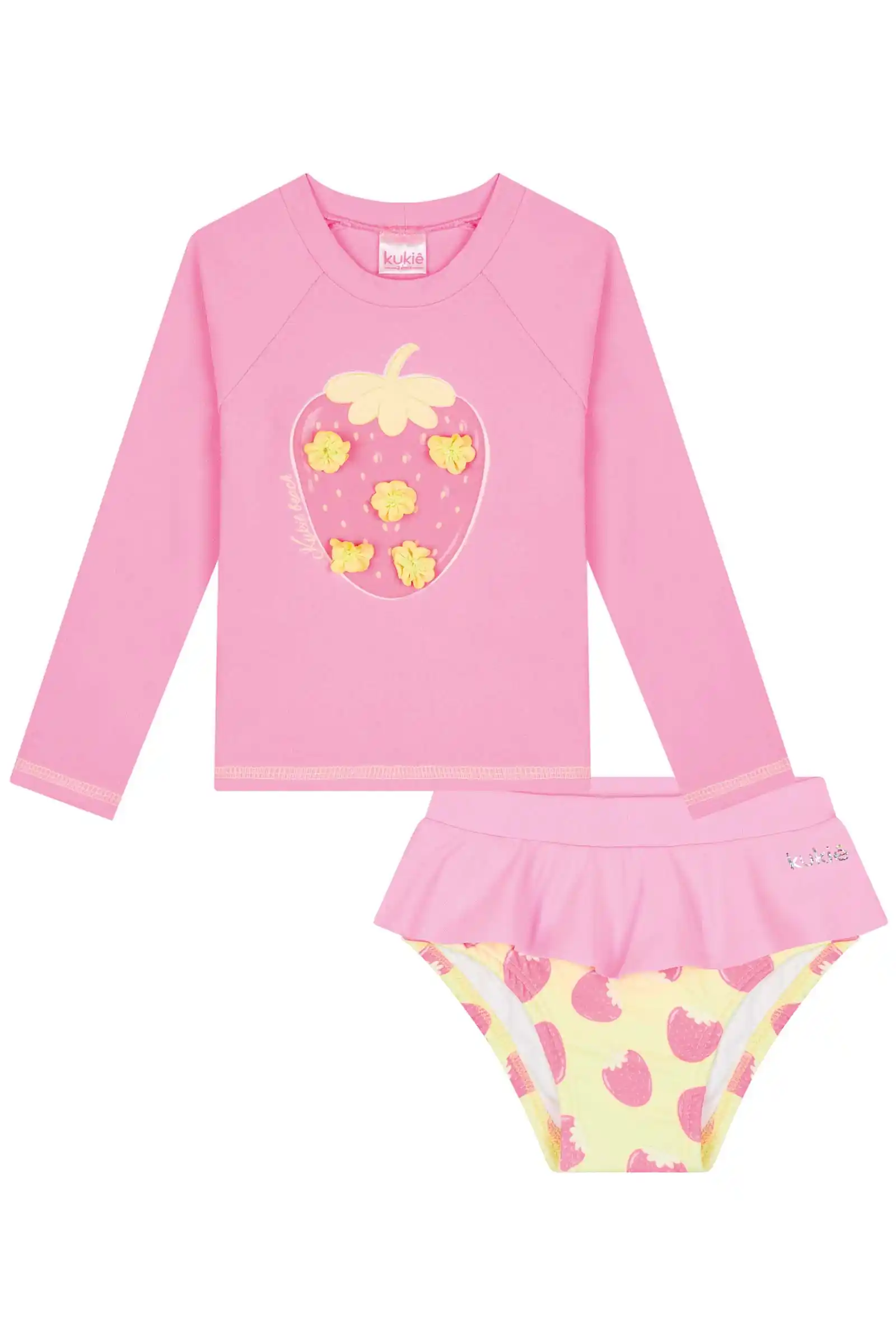 CONJUNTO BLUSA MANGA LONGA E CALCINHA COM PROTEÇÃO UV KUKIÊ é uma ótima opção para praia e piscina, além de ser muito leve e confortável, ele possui proteção uv, uma estampa de morango com detalhes super fofa e colorida e uma calcinha também estampada com babados delicados dando destaque e estilo à peça. Com costura em destaque e cores vibrantes que estão super em alta, na Pequeninos Baby Kids você encontra na opção rosa neon.