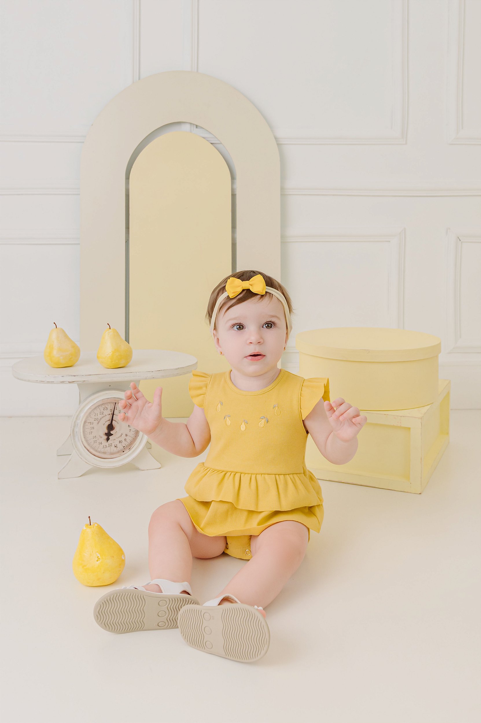 VESTIDO BODY COM BABADOS TEMA PEAR MINI BEAR é uma ótima opção para os bebês no dia a dia e também para os passeios, além de ser hipoalergênico, é muito leve e confortável, ele possui estampas de pêra super fofo com babados, com cores vivas dando destaque e estilo à peça. Na Pequeninos Baby Kids você encontra na opção amarelo.